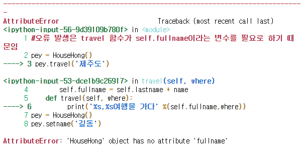 #오류 발생은 travel 함수가 self.fullname이라는 변수를 필요로 하기 때문임